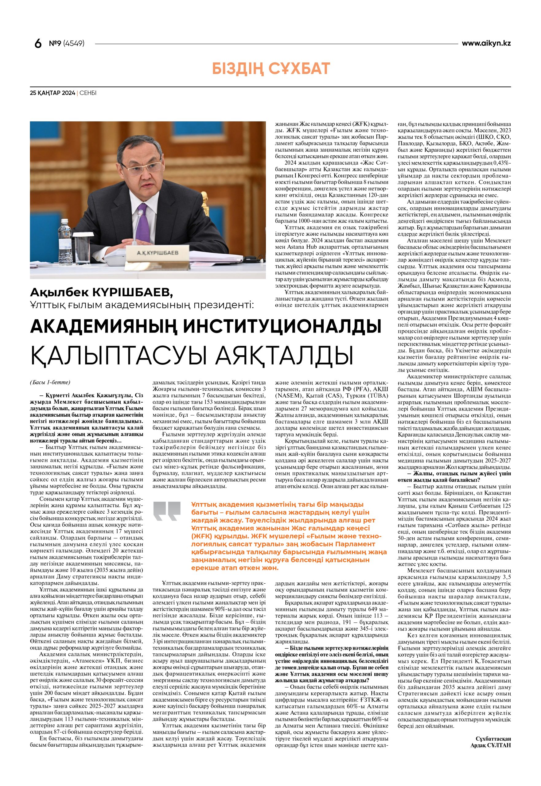 – Құрметті Ақылбек Қажығұлұлы, Сіз жуырда Мемлекет басшысының қабылдауында болып, жаңартылған Ұлттық Ғылым академиясының былтыр атқарған қызметінің негізгі нәтижелері жөнінде баяндадыңыз. Ұлттық академияның қалыптасуы қалай жүргізілді және оның жұмысының алғашқы нәтижелері туралы айтып берсеңіз…